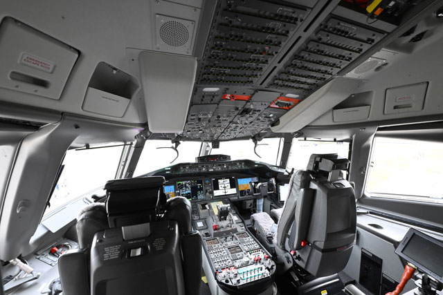 パリ航空ショーで公開された777-9飛行試験機のコックピット=23年6月18日 PHOTO: Tadayuki YOSHIKAWA/Aviation Wire