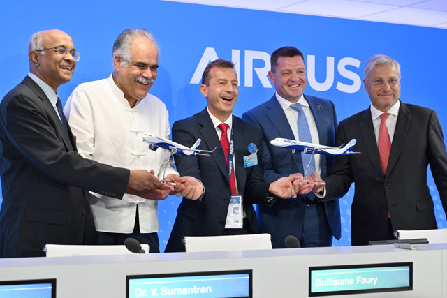 パリ航空ショーでインディゴからの受注を発表するエアバスのギヨム・フォーリCEO(中央)とインディゴのピーター・エルバースCEO(同右)ら=23年6月19日 PHOTO: Tadayuki YOSHIKAWA/Aviation Wire