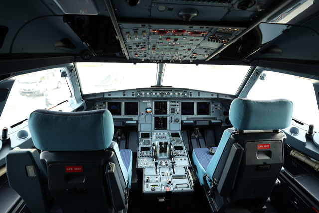 北九州空港に到着したスターフライヤーのA320neo初号機のコックピット=23年6月26日 PHOTO: Kiyoshi OTA/Aviation Wire