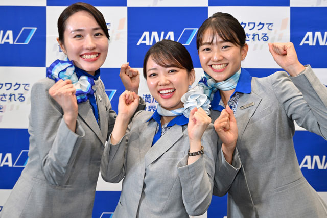 ANAの第7回Haneda’s Prideコンテストでグランプリに選ばれた立原さん(中央)、準グランプリの今井さん(左)と佐久間さん。17年度入社同期が上位を独占する結果となった=23年9月5日 PHOTO: Tadayuki YOSHIKAWA/Aviation Wire