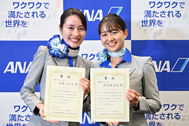 ANAの第7回Haneda’s Prideコンテストで準グランプリに選ばれた今井さん(左)と佐久間さん=23年9月5日 PHOTO: Tadayuki YOSHIKAWA/Aviation Wire