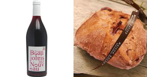 ピエール・フェロー社のボージョレ・ヌーボー(左)とメゾンカイザーのパン・オ・ボージョレ(JALの資料から)