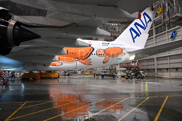 ANAのA380、オレンジ3号機初の機体洗浄 10/20就航前に2年の汚れ落とす