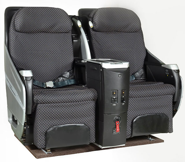 JALがシートメーカーと居心地にこだわって独自開発したもので、グッドデザイン賞を受賞。客室改修で取り下ろされたもので、実際に運航していたものであるため、キズなどがあるという。