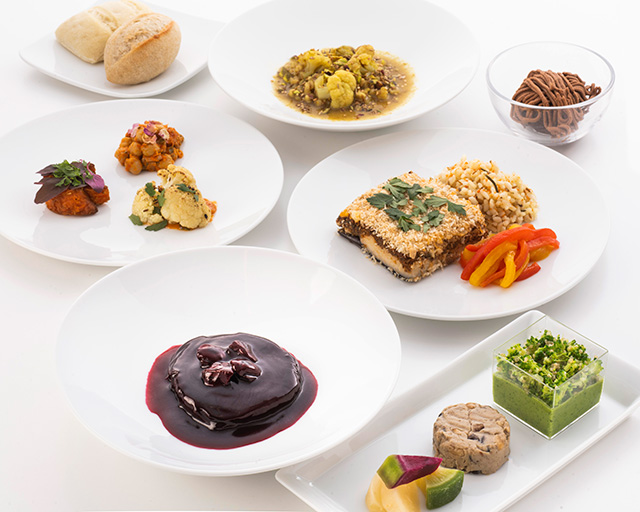 JALの国際線ファースト・ビジネスクラスで提供するビーガン・ベジタリアンコースメニュー(同社提供)
