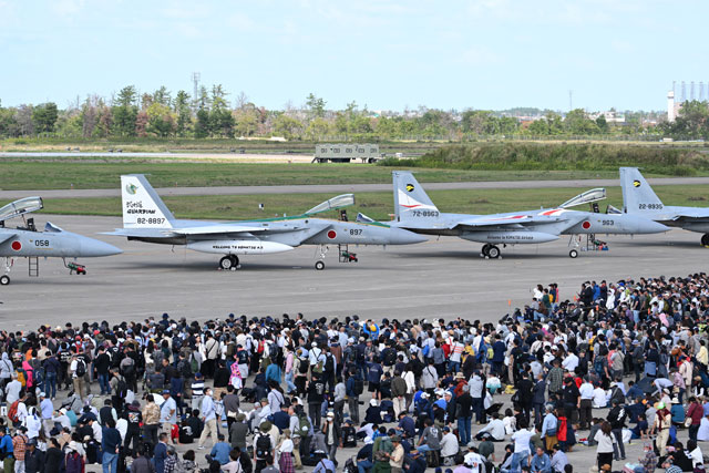 小松基地航空祭に展示された303飛行隊の日豪共同訓練特別塗装機(左)と306飛行隊の日伊共同訓練特別塗装機=23年10月7日 PHOTO: Tadayuki YOSHIKAWA/Aviation Wire