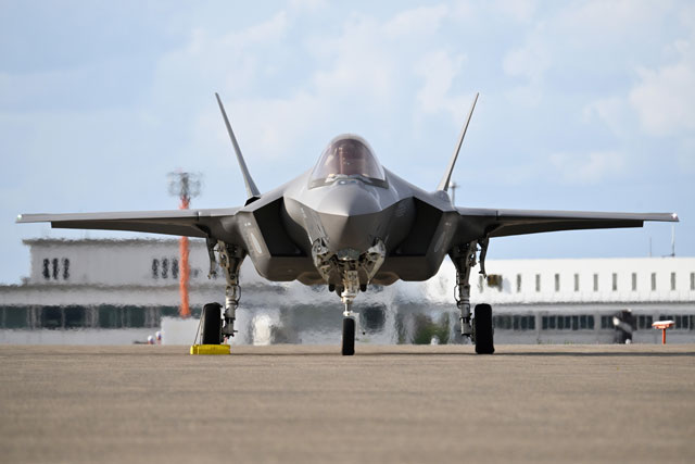 小松基地航空祭の地上展示を終えて帰投する空自のF-35=23年10月7日 PHOTO: Tadayuki YOSHIKAWA/Aviation Wire