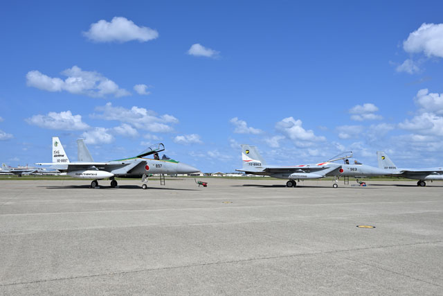 小松基地航空祭に展示された303飛行隊の日豪共同訓練特別塗装機(左)と306飛行隊の日伊共同訓練特別塗装機=23年10月7日 PHOTO: Tadayuki YOSHIKAWA/Aviation Wire