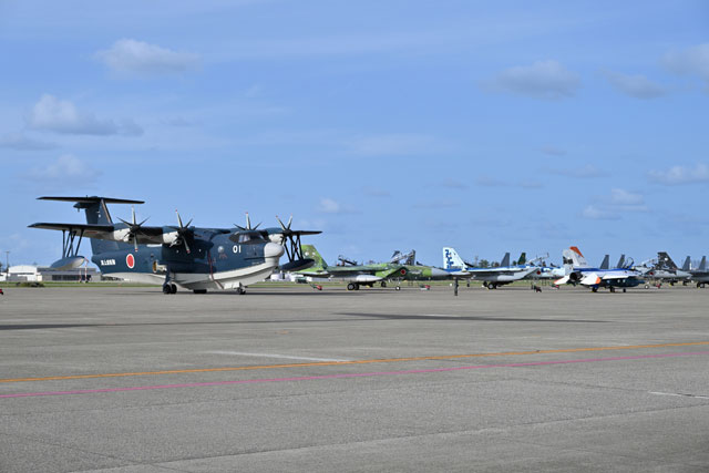 小松基地航空祭の地上展示を終えて帰投する海自のUS-2(手前)=23年10月7日 PHOTO: Tadayuki YOSHIKAWA/Aviation Wire