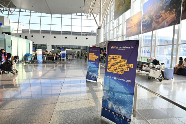 ノイバイ国際空港に置かれたWSOCのバナー=23年9月 PHOTO: Tadayuki YOSHIKAWA/Aviation Wire