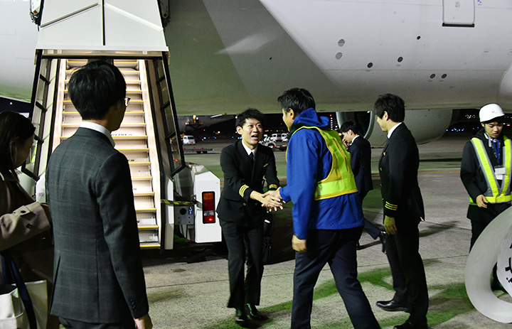 JAL最後の777-200ER JA703Jのロサンゼルス行き退役チャーター便JL8132便に添乗する井上副操縦士(中央)と握手する立花本部長=23年12月12日 PHOTO: Yusuke KOHASE/Aviation Wire