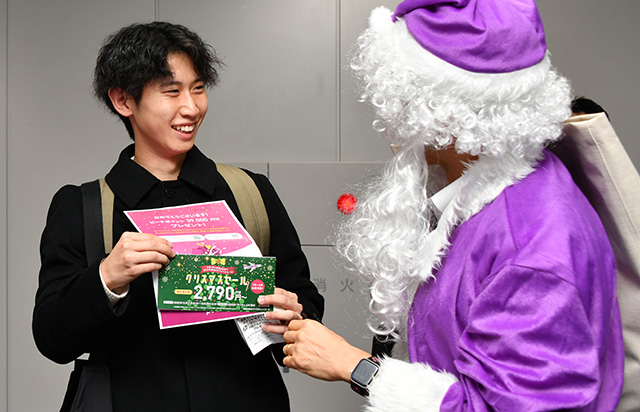 イベントには、紫色のサンタクロースの格好をした同社成田空港所の潮田(うしおだ)高志所長が参加。抽選会に来た利用客に声をかけたり、子供にプレゼントを渡したりするなどと交流した。このほか台湾烏龍茶の試飲会も同時に開催し、訪日客とは対照的にコロナ後の回復が鈍い出国やパスポート取得などを喚起した。