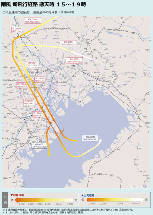 南風運用時は、事故によりPAPI(進入角指示灯)が損傷を受けたため、都心上空を飛行するルートで運用。通常は南風運用の悪天候時に午後3時から午後7時まで使用するルートを使う。1カ月以内にはPAPIを復旧できる見通し。国交省航空局(JCAB)によると、C滑走路のILS(計器着陸装置)は事故による損傷を受けておらず、JAL機の撤去が完了したことから通常通り運用できるという。北風運用も通常通りとなる。