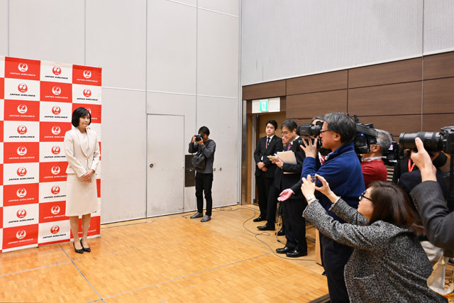 JALの新社長に就任する鳥取三津子専務(左)を撮影する報道陣=24年1月17日 PHOTO: Tadayuki YOSHIKAWA/Aviation Wire