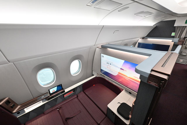 JAL、新旗艦機A350-1000初公開 個室ファーストは天井広々、羽田-NY 1/24就航(23年12月14日)