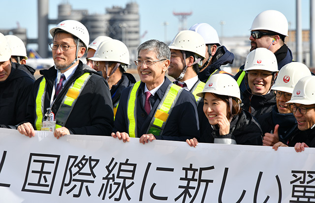 羽田空港で横断幕を掲げJAL A350-1000初便ニューヨーク行きJL6便を見送った赤坂社長(中央)=24年1月24日 PHOTO: Yusuke KOHASE/Aviation Wire