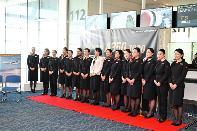 24日に羽田空港第3ターミナルで開かれた就航式典で、JALの赤坂祐二社長は「A350-1000は省燃費、脱酸素、CO2(二酸化炭素)排出量が非常に少ない飛行機。従来の777と比較して燃料、CO2排出量を約25%削減でき、ニューヨークまでドラム缶で片道800本相当の燃料が必要だったが200本くらい少なくて済む」と、A350-1000の燃費やCO2排出量の優位性を説明。「大型機の特性を活用した。シートも新しくなったが、インテリア、機内食、機内エンターテインメントも一新した。ニューヨークまで長い旅になるが、存分にお楽しみいただきたい」とあいさつした。