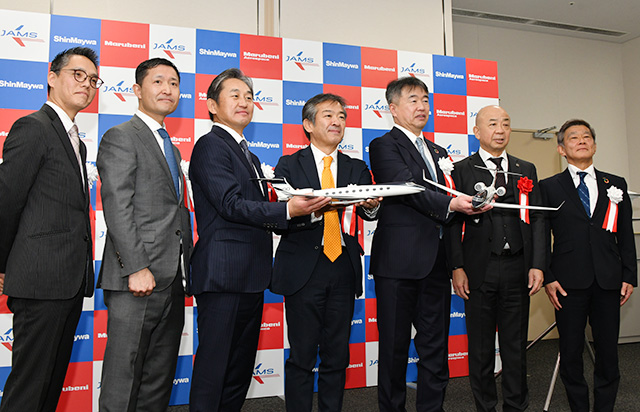 新会社JAMS設立の調印式に出席した(左から)JAMSの藤本副社長、JAMSの西川社長、丸紅 航空・船舶本部の岡﨑徹本部長、丸紅エアロスペースの上瀧社長、新明和の田中常務、中部国際空港会社の犬塚社長、新明和の石丸寛二副社長=24年2月6日 PHOTO: Yusuke KOHASE/Aviation Wire