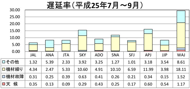 遅延率はWAJが29.41%でワースト1位。遅延理由は