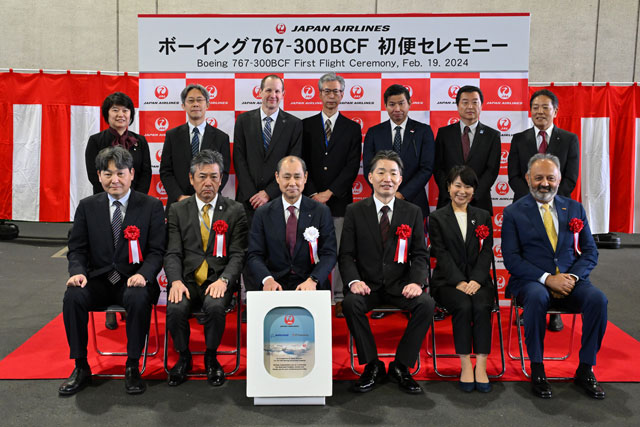 成田空港で開かれたJALの767-300BCF就航記念式典で記念写真に収まる貨物郵便本部の本部長を務める木藤祐一郎執行役員ら=24年2月19日 PHOTO: Tadayuki YOSHIKAWA/Aviation Wire