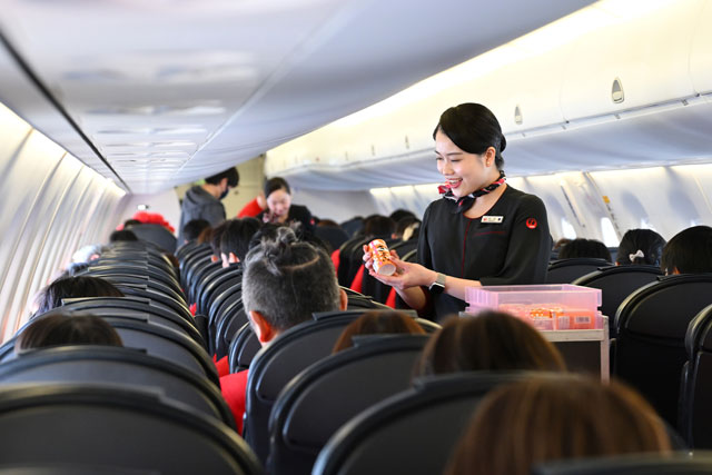 JALミャクミャクJETチャーターで機内サービスする客室乗務員の大廻さん=24年4月14日 PHOTO: Tadayuki YOSHIKAWA/Aviation Wire
