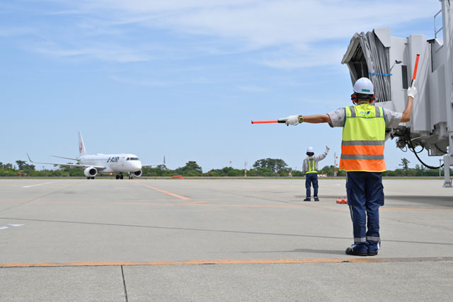 グラハン資格の相互承認でマーシャリング資格を取得し、仙台空港でANAのビブスを着用してJAL便をスポットへ誘導する日通の千葉晃史さん=24年5月14日 PHOTO: Tadayuki YOSHIKAWA/Aviation Wire