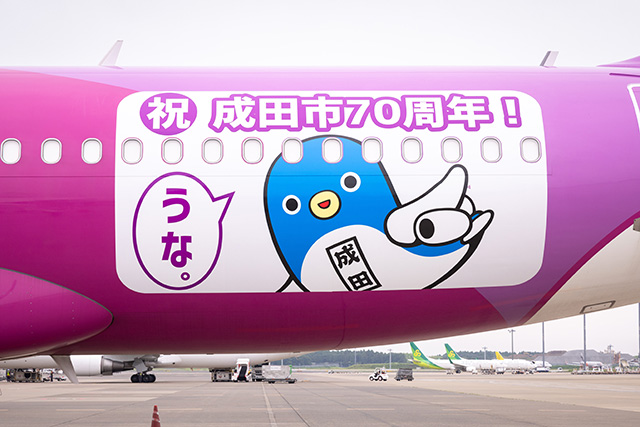 ピーチ・アビエーション(APJ/MM)は6月21日、成田市の市制施行70周年を記念したデザイン機「うなりくんジェット」(エアバスA320ceo、登録記号JA824P)を成田発便で就航させた。市の観光キャラクター「うなりくん」を大きくデザインしたラッピング機で、成田発の初便となった那覇行きMM503便は、乗客169人(幼児2人含む)を乗せて午前8時12分に出発した。12月ごろまで、約半年間の運航を予定している。