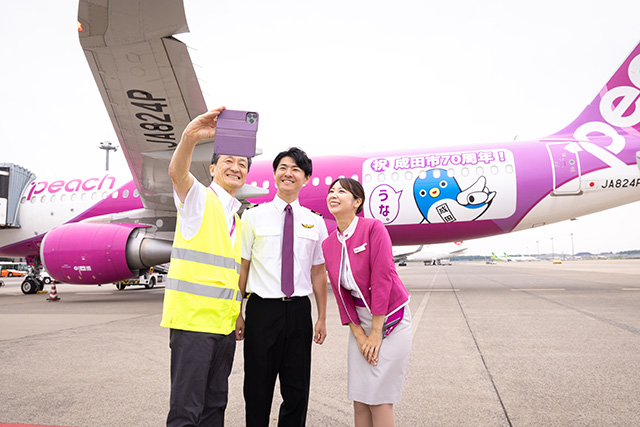 成田市の市制施行70周年を記念したデザイン機「うなりくんジェット」と記念撮影する(左から)ピーチ成田空港所の潮田高志所長、パイロット、客室乗務員=24年6月21日 PHOTO: Tatsuyuki TAYAMA/Aviation Wire