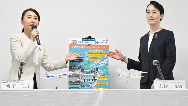 カスハラ対処方針を共同発表するANAの宮下CS推進部長とJALの上辻CX推進部長=24年6月28日 PHOTO: Tadayuki YOSHIKAWA/Aviation Wire