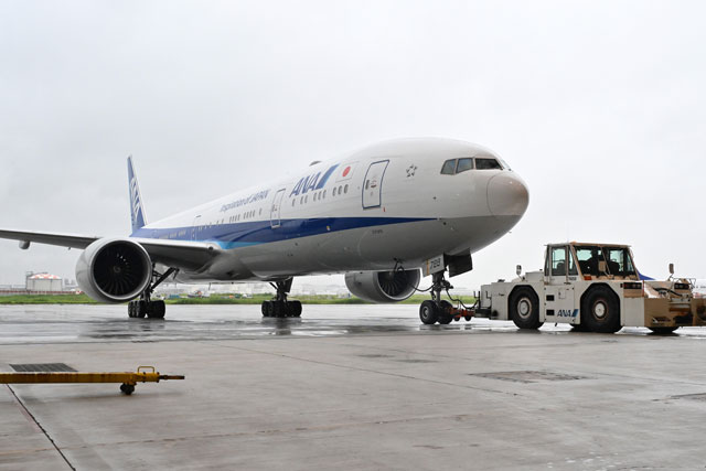 ウェディングフォト撮影のため羽田空港のANA格納庫にトーイングされる777-300ER=24年6月28日 PHOTO: Tadayuki YOSHIKAWA/Aviation Wire