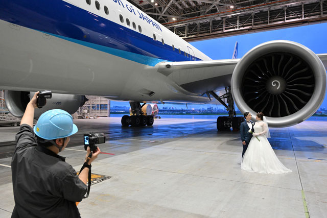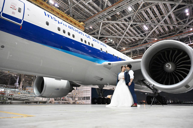 ANA、夜の格納庫でウェディングフォト 777背景に