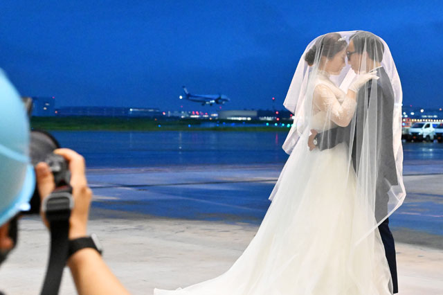 羽田空港のANA格納庫で行われたウェディングフォトの撮影=24年6月28日 PHOTO: Tadayuki YOSHIKAWA/Aviation Wire