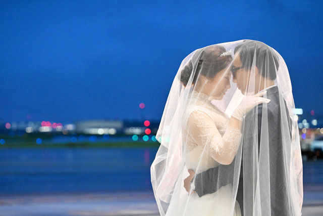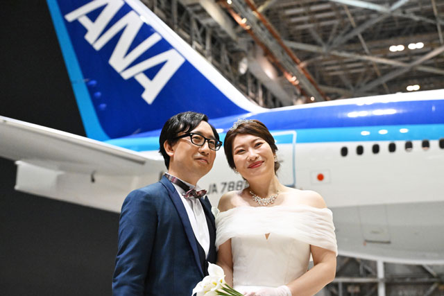 羽田空港のANA格納庫でウェディングフォトを撮影した辻本さん夫妻=24年6月28日 PHOTO: Tadayuki YOSHIKAWA/Aviation Wire