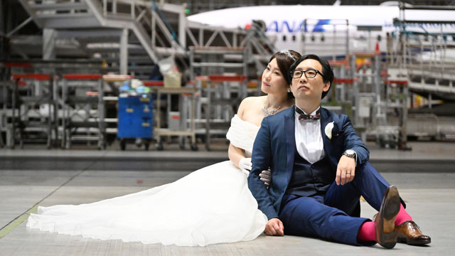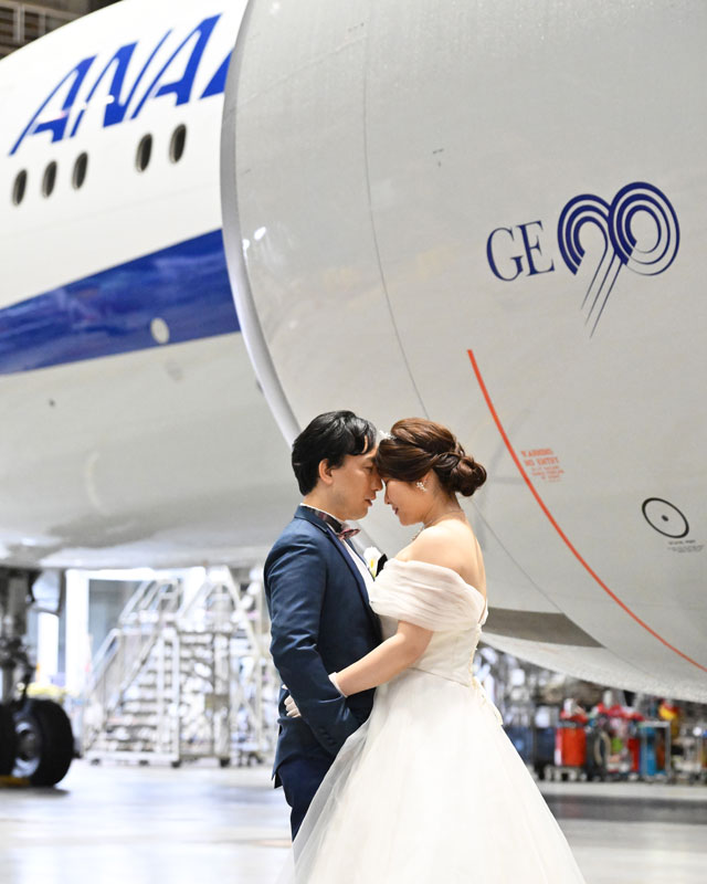 カップルのために機体を1機貸切で用意し、夜の格納庫でウェディングフォトを撮影。衣装はワタベウェディングのドレスショップで事前フィッティングし、同社のプロカメラマンが撮影した。撮影後は同ホテルのコンセプトルーム「ANA ROOM」に宿泊し、フライトシュミレーターを設置した客室「スーペリアコックピットルーム」でも撮影できる。