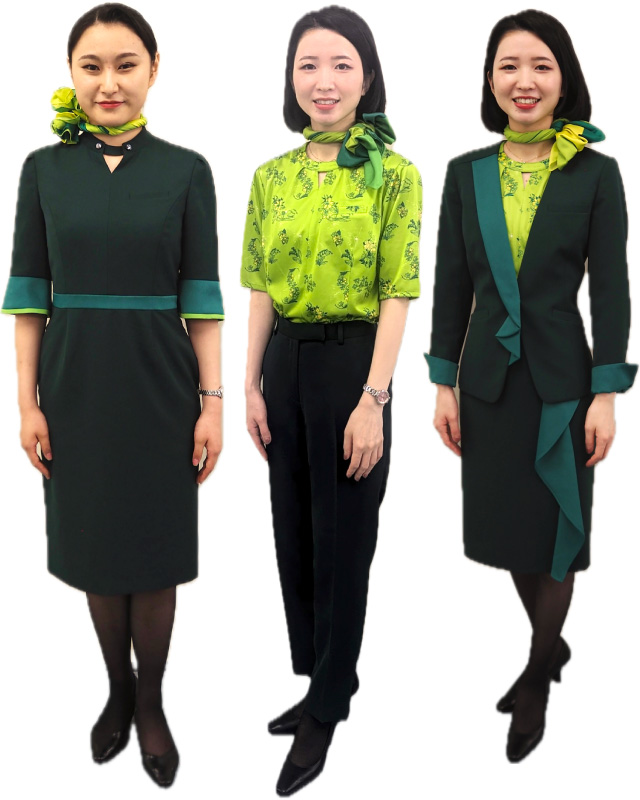 女性用は、従来のジャケットとブラウス、スカート、ワンピースに加え、裾に向かって細くなるテーパードシルエットのパンツとベストを新たに採用。個性や好みに合わせ着用できるようにした。またブラウスには、社名の「春」にちなみ、モモとサクラの花をデザイン。太陽や管制塔、機体もあしらった。