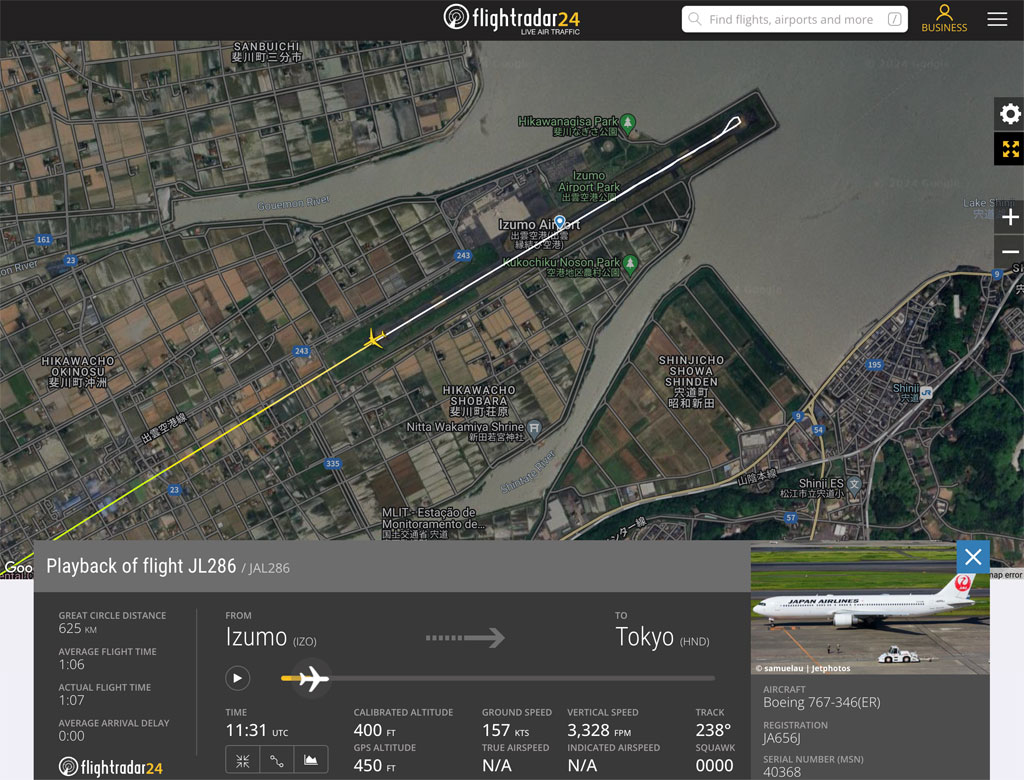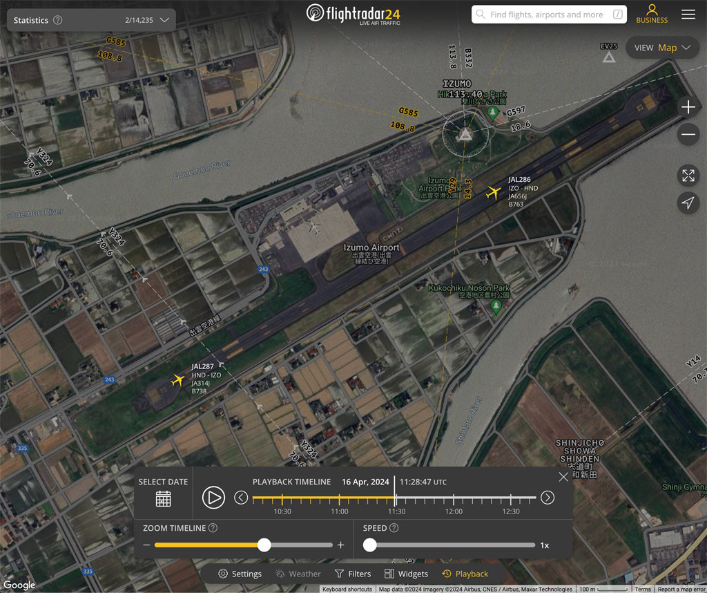 24年4月16日午後8時28分時点の出雲空港の様子。左は午後8時26分に着陸した羽田発JL287便、右は午後8時15分に出発し同31分に離陸した羽田行きJL286便(Flightradar24から、実際の位置とは誤差がある場合があります)