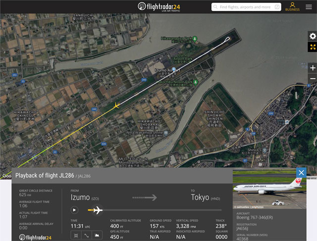 出雲は滑走路が1本(RWY07/25)で並行する誘導路もないため、着陸したJL287便は滑走路端で折り返し、中ほどの地点で滑走路から離脱した後、羽田行きJL286便が午後8時31分に離陸した。