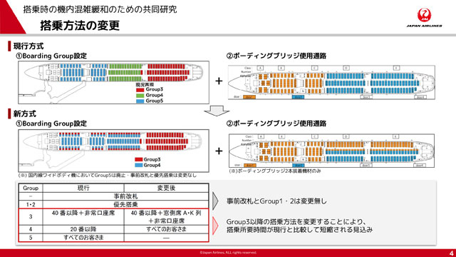 変更後は「事前改札」と「優先搭乗」までは同じで、「グループ3」で40番以降と窓側席のA列とK列、非常口座席の乗客が搭乗し、「グループ4」ですべての乗客が搭乗する。これにより「グループ5」は対象機材では廃止となり、従来より1段階少ない4段階の搭乗になった。