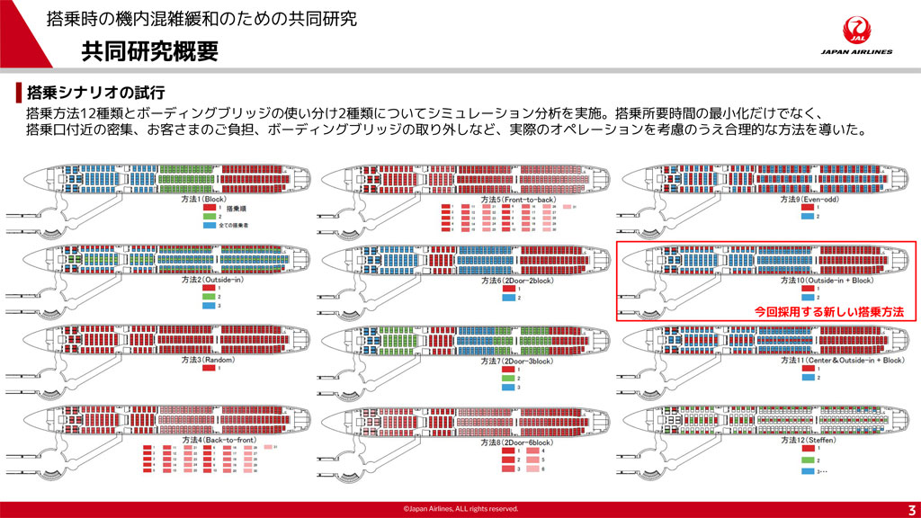 日本航空(JAL/JL、9201)は9月11日、国内線の搭乗方法をエアバスA350-900型機など中大型機で見直した。搭乗時の機内混雑を緩和する取り組みで、東京工業大学との共同研究結果を反映した。従来の方法と比べ搭乗時間が平均約50秒短縮されて定時性向上につなげられるほか、乗客が機内混雑で感じるストレスの緩和につながるという。