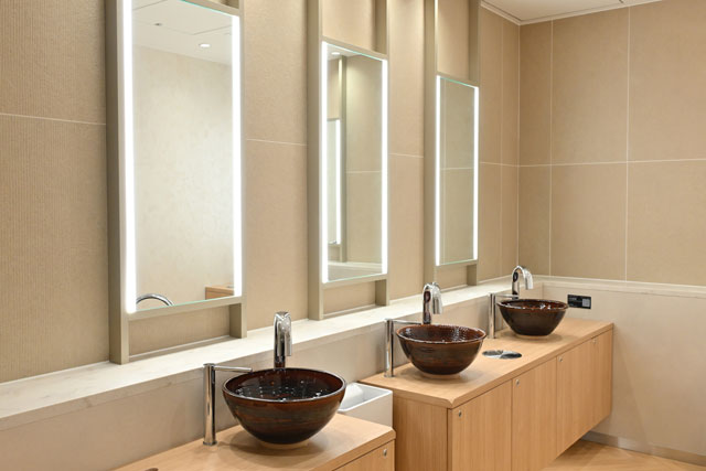 福岡空港の国際線ラウンジ「ラウンジ福岡」の化粧室に設けられた小石原焼の洗面ボウル=24年9月25日 PHOTO: Tadayuki YOSHIKAWA/Aviation Wire