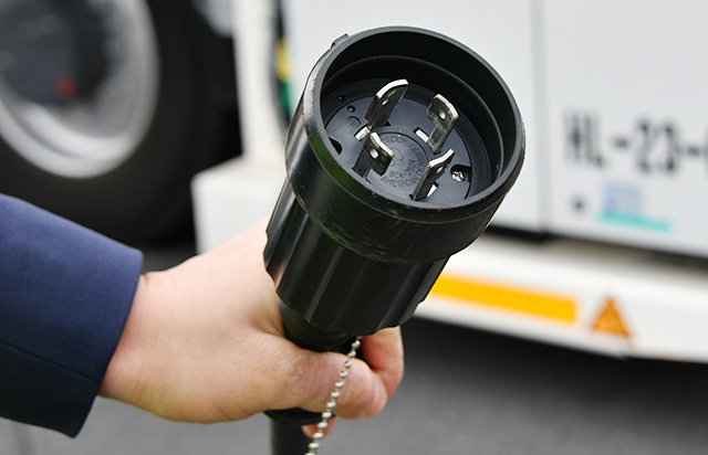 アメリカンロック形式を採用したJALの電動ハイリフトローダーの電源プラグ=25年1月27日 PHOTO: Yusuke KOHASE/Aviation Wire