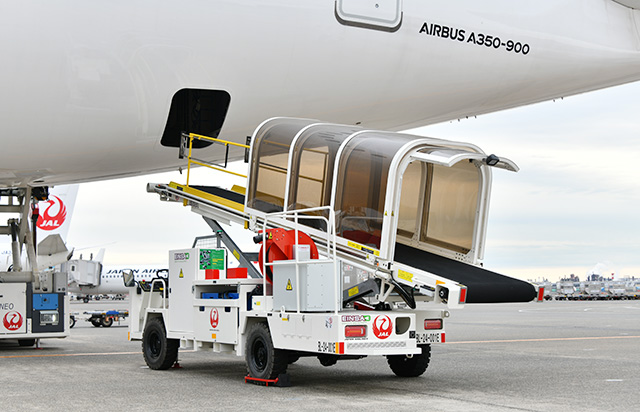 羽田へ到着したA350-900から手荷物を取り下ろしたJALの電動ベルトローダー=25年1月27日 PHOTO: Yusuke KOHASE/Aviation Wire
