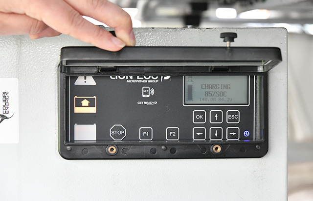 充電状況を知らせるJALの電動ハイリフトローダーに備えるオンボードチャージャー=25年1月27日 PHOTO: Yusuke KOHASE/Aviation Wire