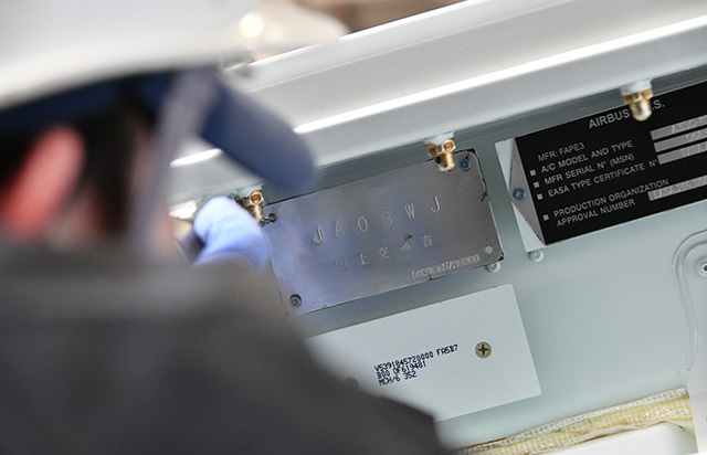 8号機JA08WJの識別板を取り付けるJALの整備士=24年12月 PHOTO: Yusuke KOHASE/Aviation Wire