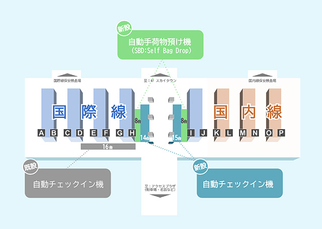 SBDは3階の国際線HカウンターとIカウンターそばに8台ずつ設ける。自動チェックイン機は29台増設し、Hカウンター側に14台、Iカウンター側に15台設置する。中部空港は自動チェックイン機を16台導入済みで、既存のものと合わせ45台導入することになる。