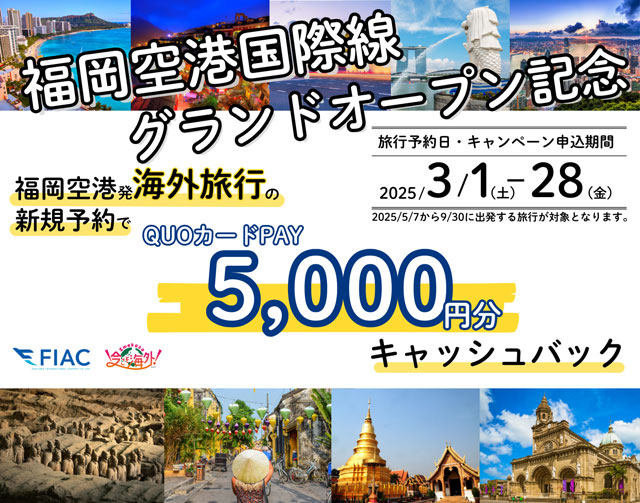 福岡空港を運営する福岡国際空港会社(FIAC)は、国際線ターミナルのグランドオープンを記念し「海外旅行5000円キャッシュバックキャンペーン」を実施する。日本人の海外旅行需要の回復を促す。