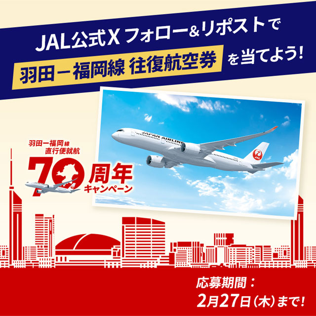 日本航空(JAL/JL、9201)は、羽田-福岡線の就航70周年を記念し、往復航空券が当たるキャンペーンをX(旧Twitter)で実施している。応募は2月27日まで。