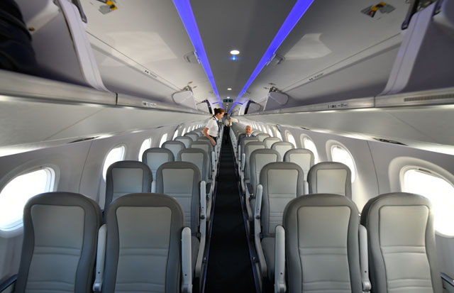 ファンボローで出発を待つE190-E2飛行試験機の機内=18年7月 PHOTO: Tadayuki YOSHIKAWA/Aviation Wire