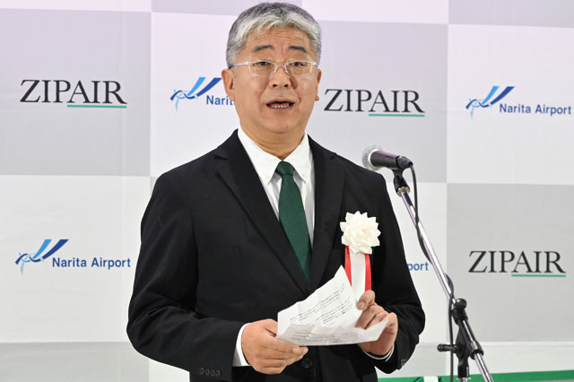 成田空港で開かれたヒューストン線就航式典で挨拶するZIPAIRの西田真吾社長=25年3月4日 PHOTO: Tadayuki YOSHIKAWA/Aviation Wire