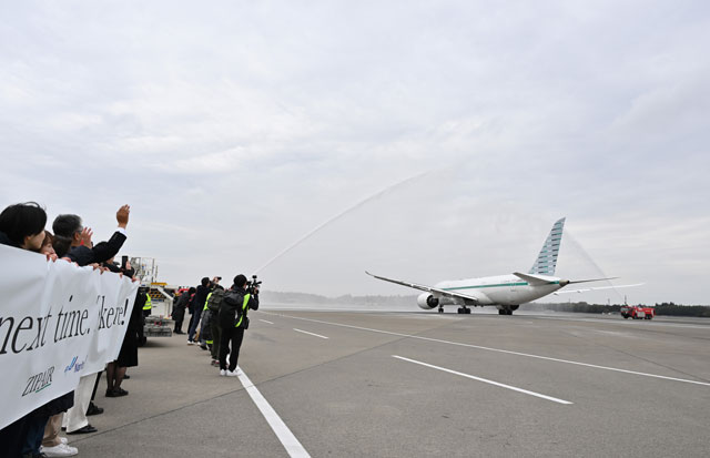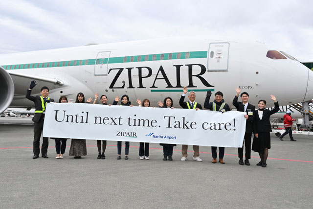 成田空港でヒューストン行き初便ZG16便を見送るZIPAIRの社員=25年3月4日 PHOTO: Tadayuki YOSHIKAWA/Aviation Wire